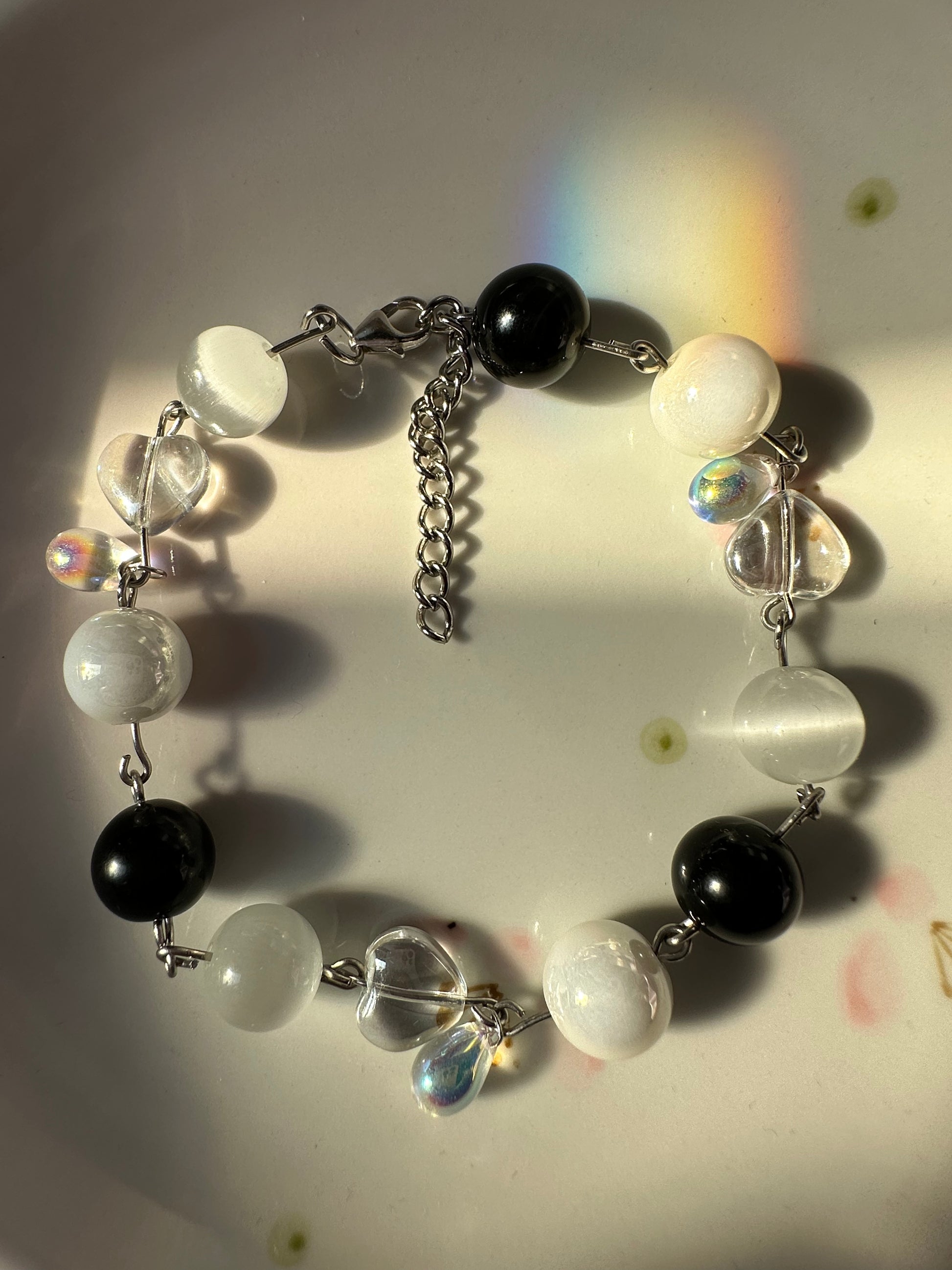 ♡ Made with fiber optic cat eye beads, white glass beads, black Onyx, clear glass heart beads, and iridescent glass teardrop beads.