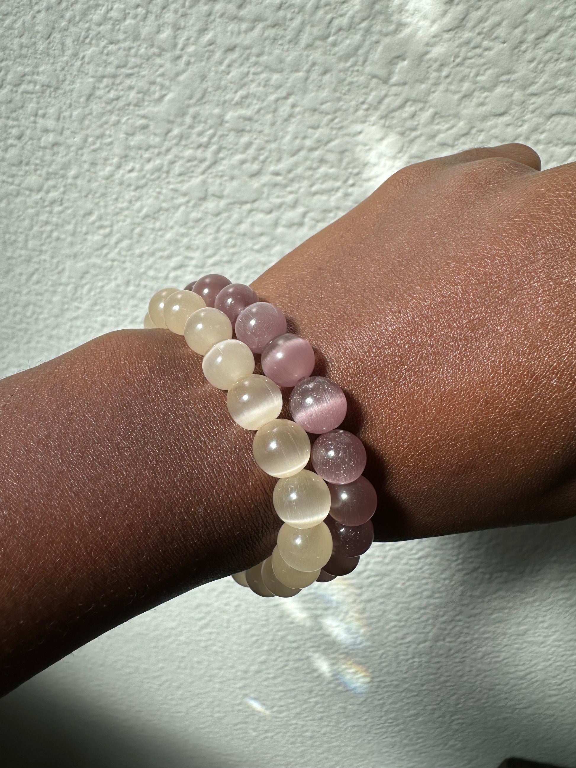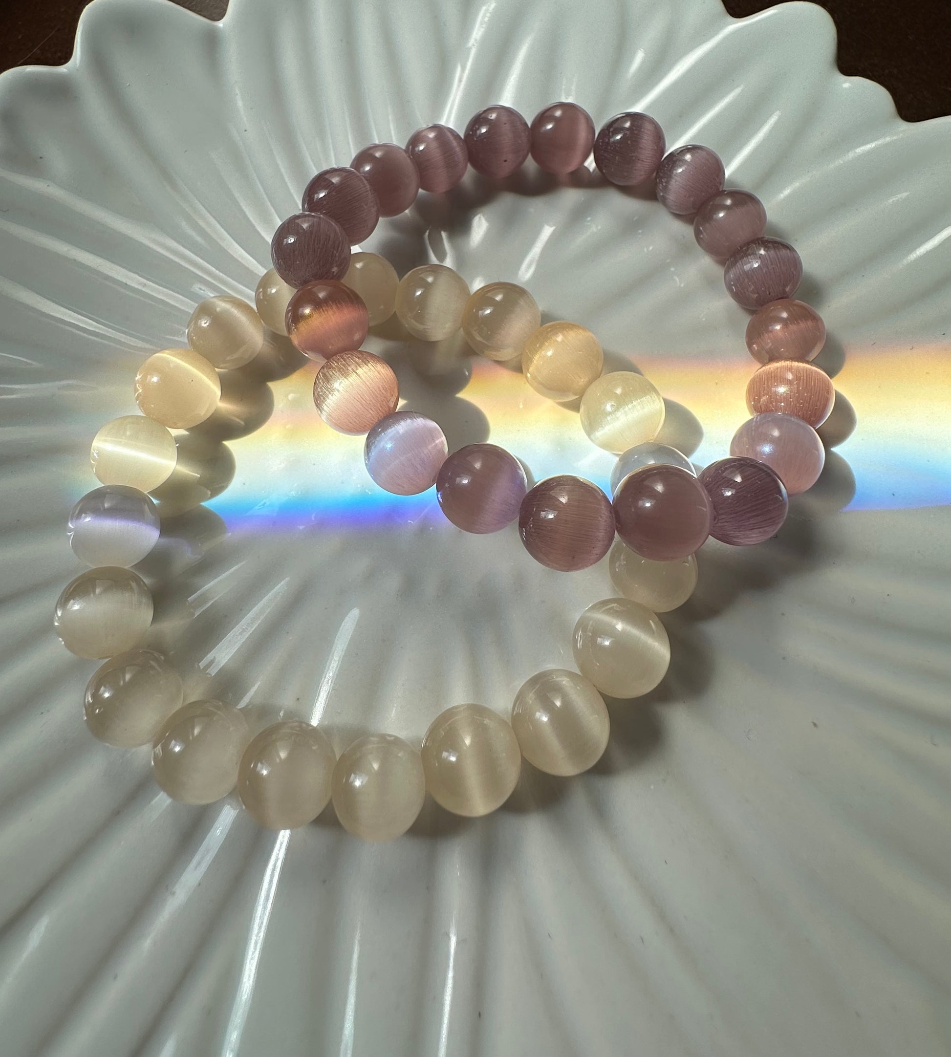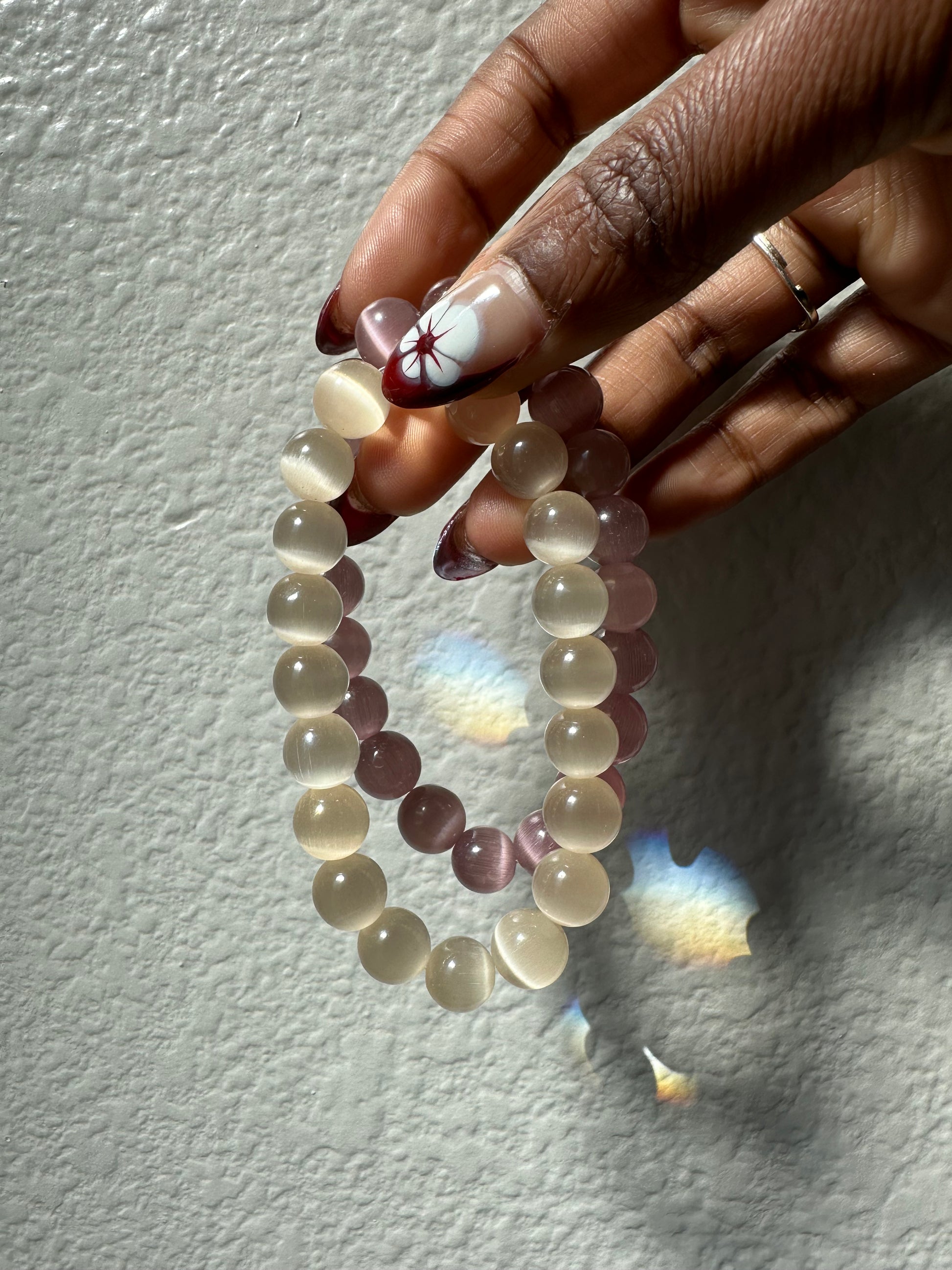 ♡ A 2-piece set sweetly handmade with 10mm pastel pinkish-purple and cream fiber optic Cats-Eye beads.