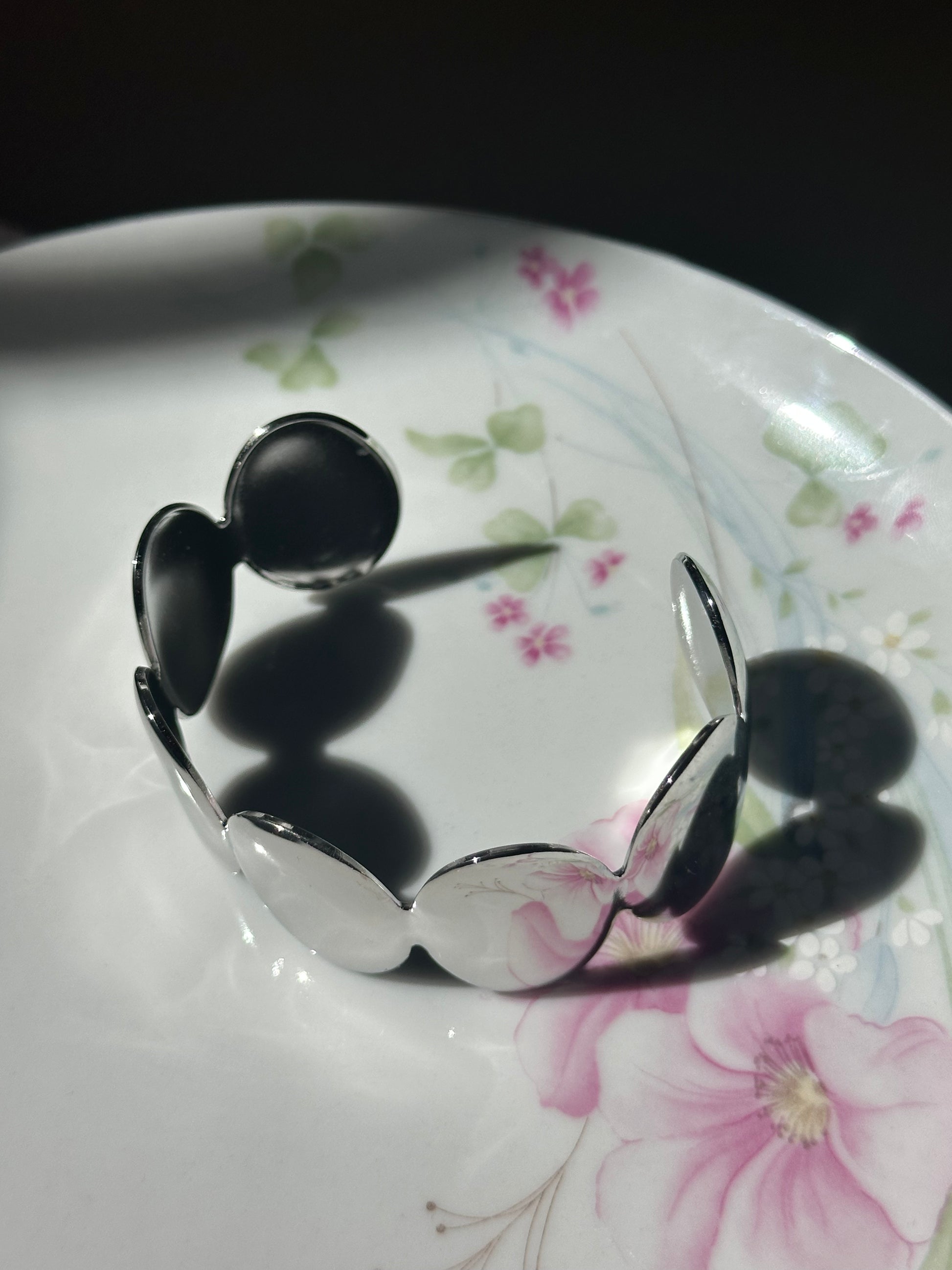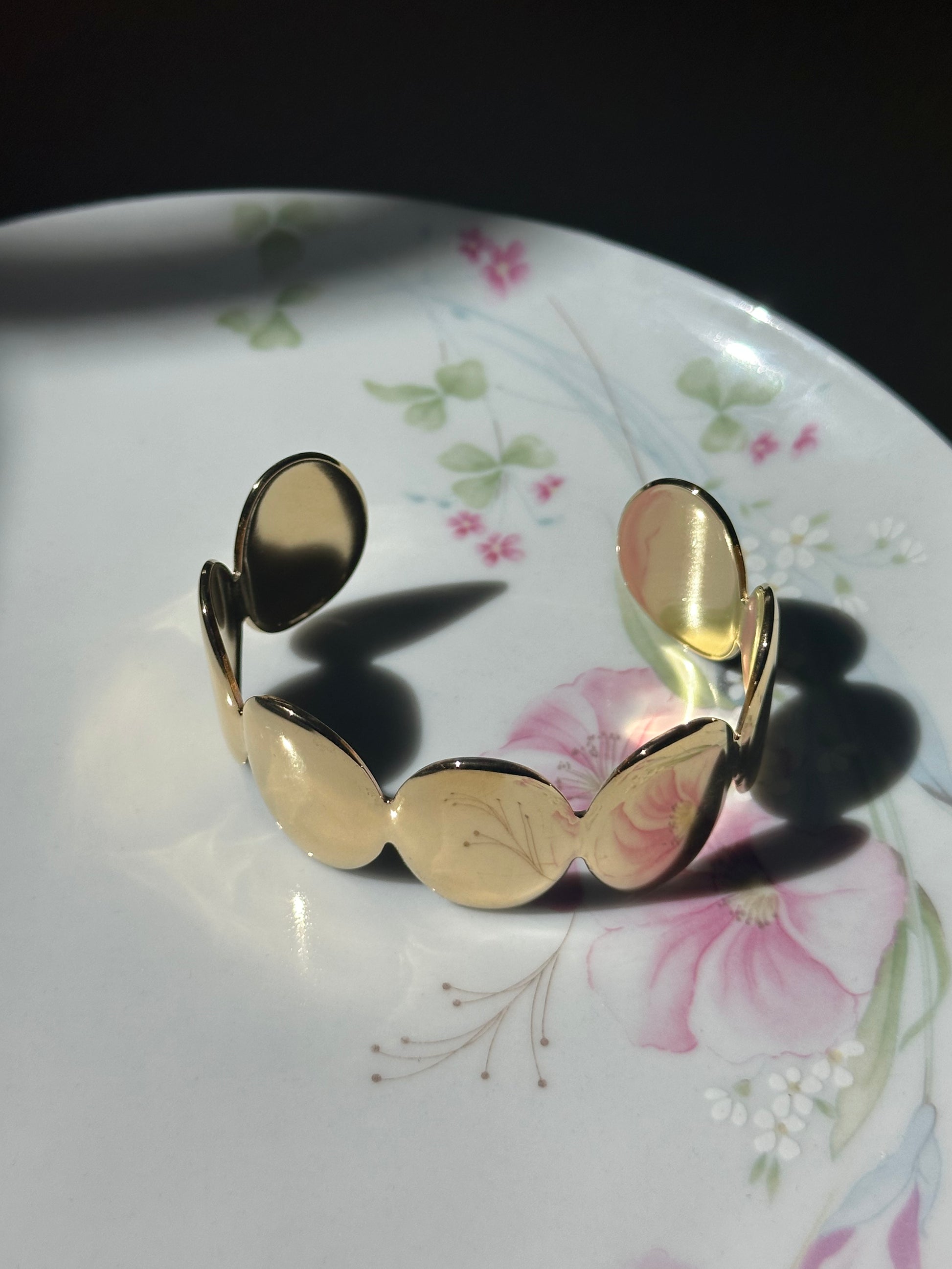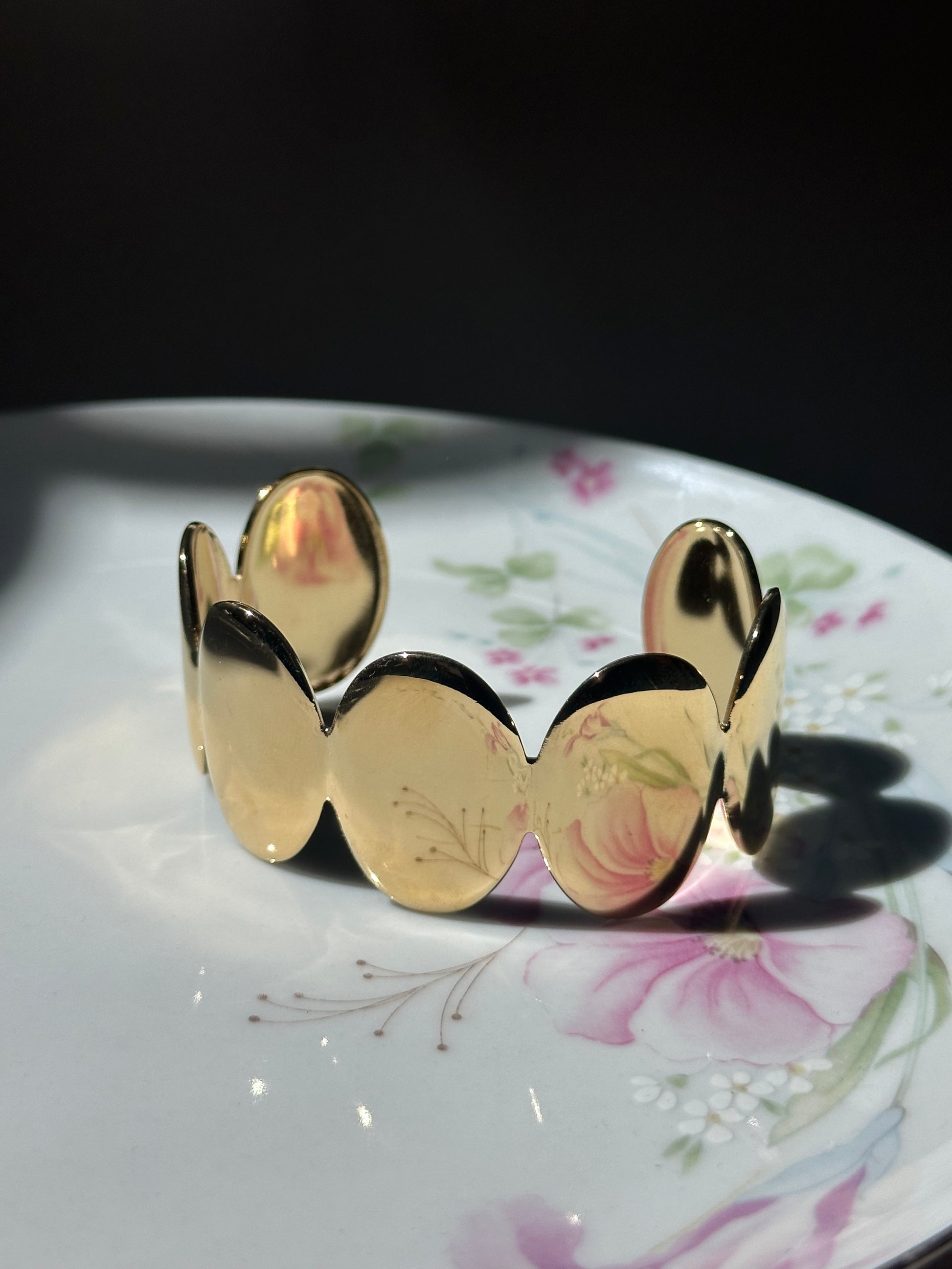 ♡ 7in in diameter; Squeeze or pull to adjust sizing smaller to wrist as a bracelet or larger on forearm as an arm cuff.