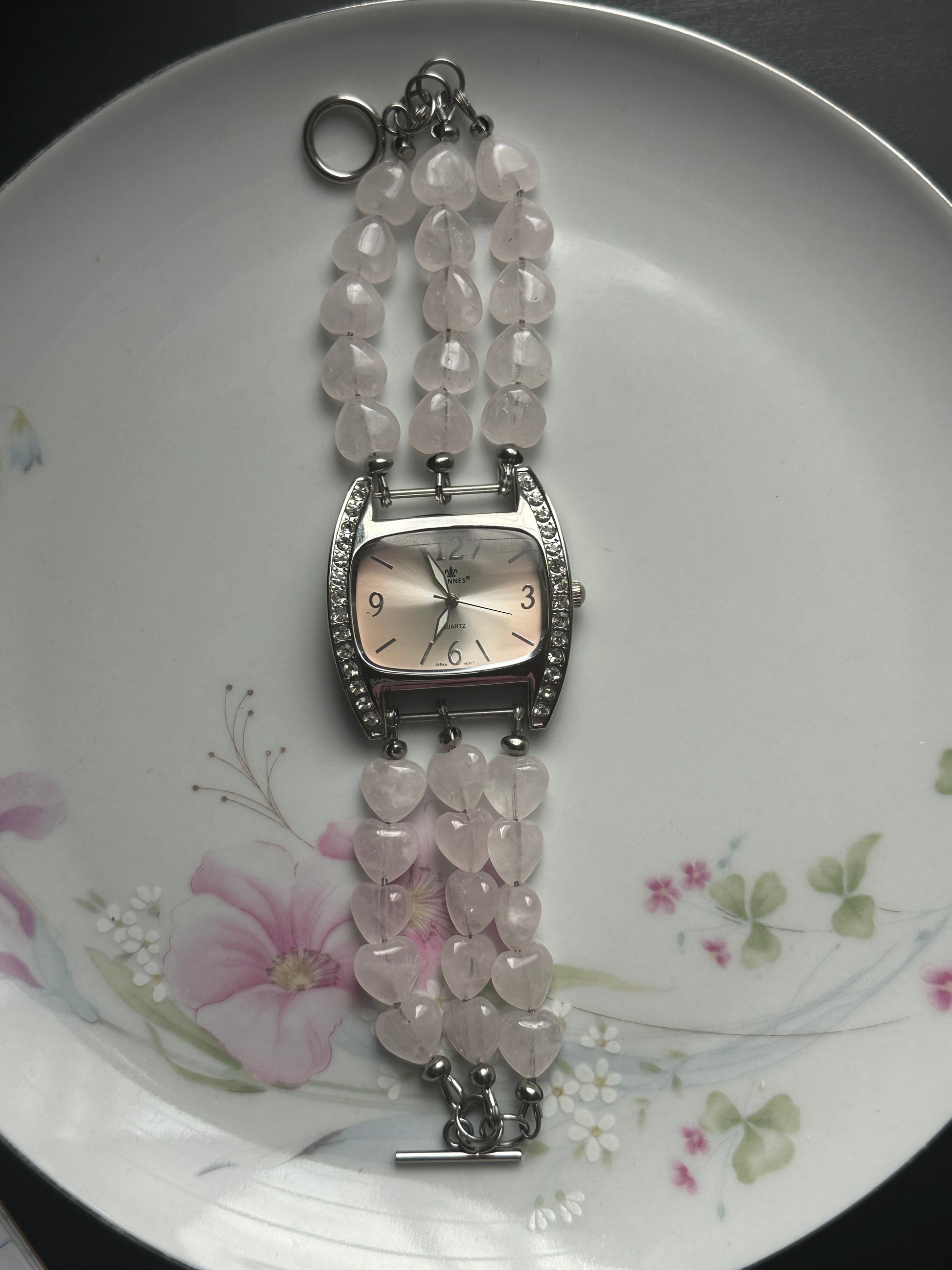 ♡︎ Second-hand/ vintage watch face, with handmade beaded Rose Quartz heart beads.
