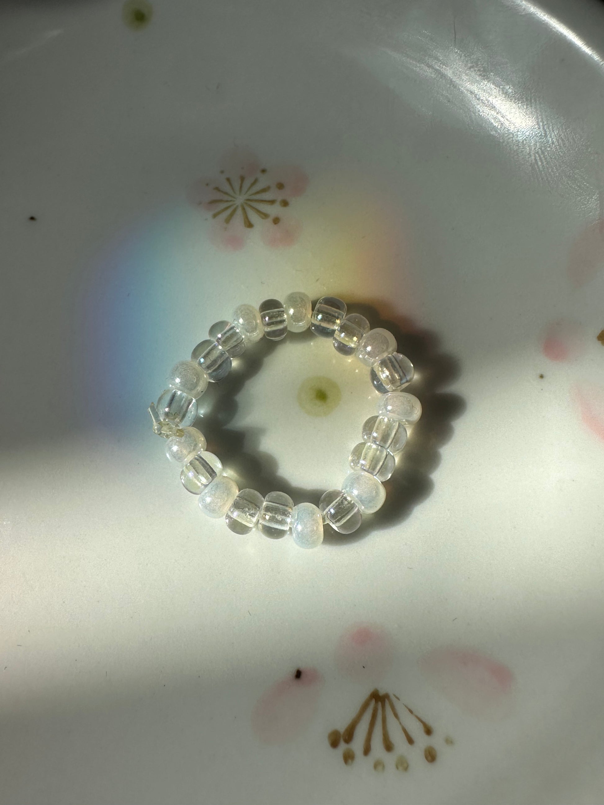 ♡ Dainty beaded ring handmade with pastel green and iridescent glass seed beads